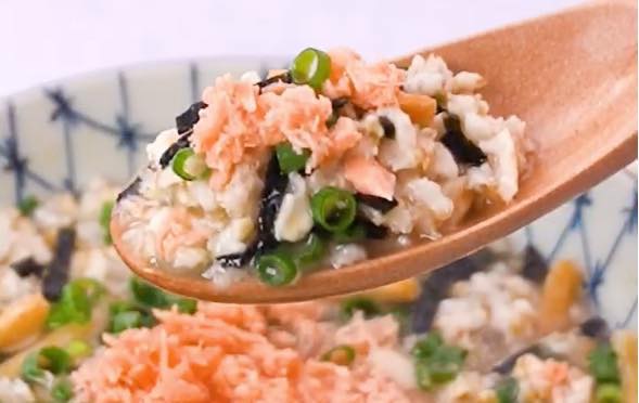 3. レンジから取り出して混ぜ、お好みで鮭フレークやネギをトッピングする