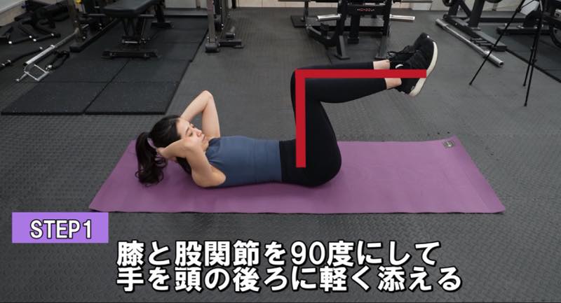 1.膝、股関節を90度にして、手を頭の後ろに軽く添える