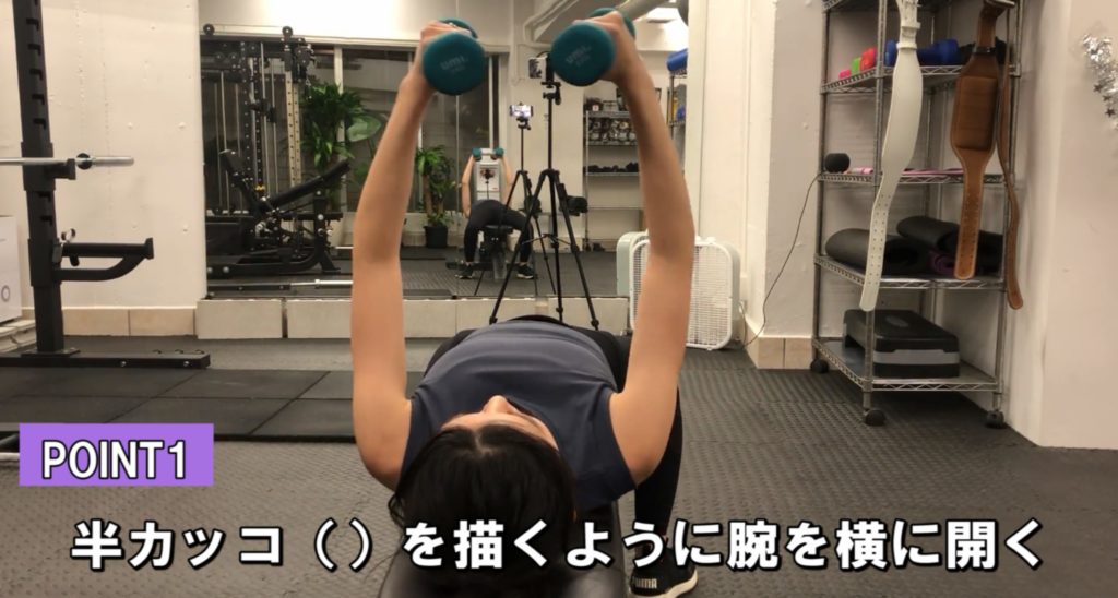 1.軽く肘を曲げ、バストトップを軸に半カッコ()を描くようにダンベルを持った腕を横に開いていく
