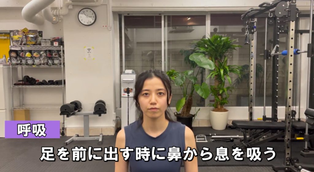 1.前の足がつま先より前に出ないように、膝が90度になるまで上体を下げる