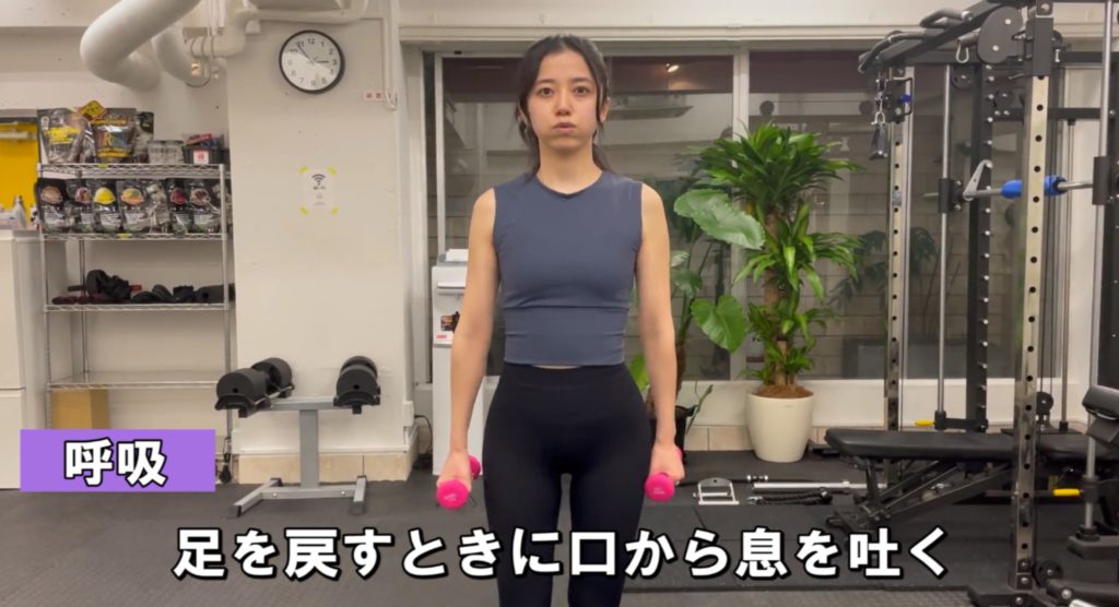 1.ダンベルを両手で持ち、足を拳一つ分開けて立つ