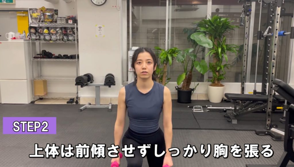 2.重心がブレてしまうとフォームが崩れるため、膝を内側に入れないように意識をする