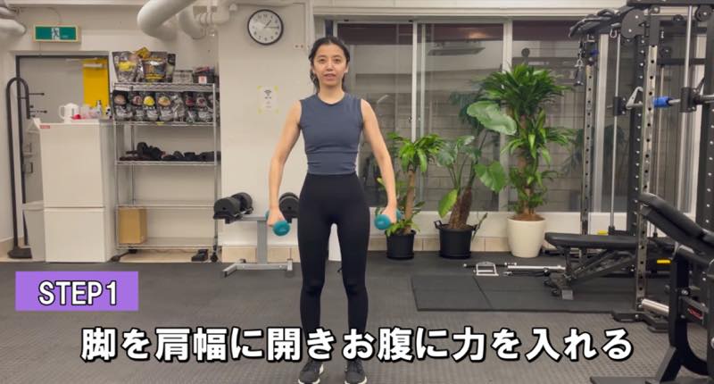 1.ダンベルを両手で持ち、足を肩幅に開きお腹に力を入れる