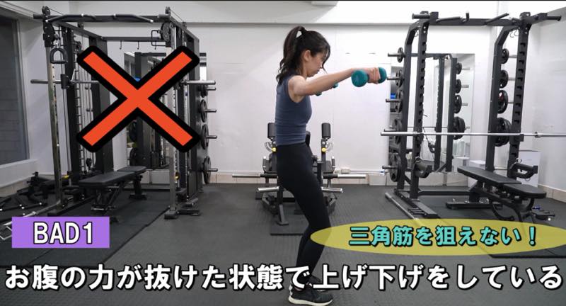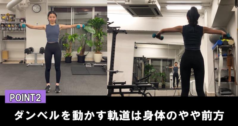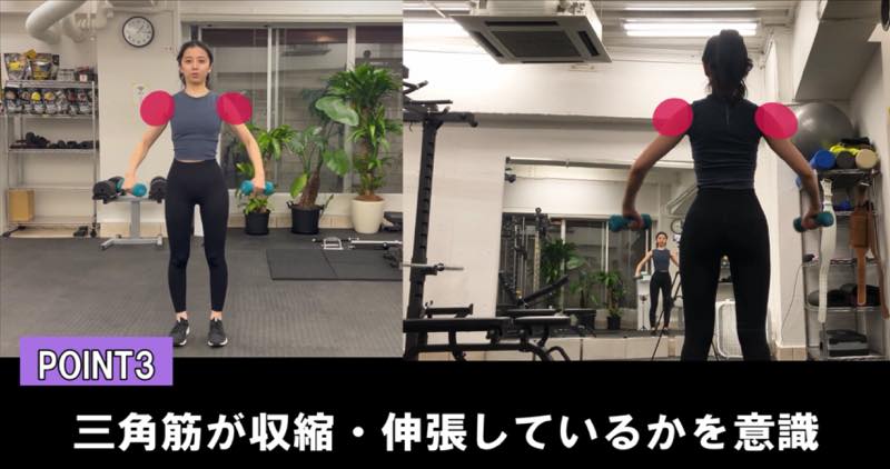 反動を使ってダンベルを上げ下げしないように、常に三角筋を意識して行いましょう。